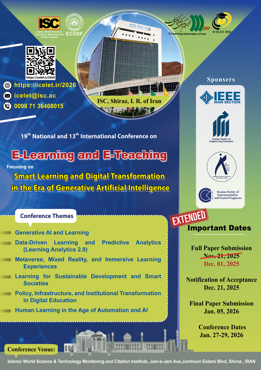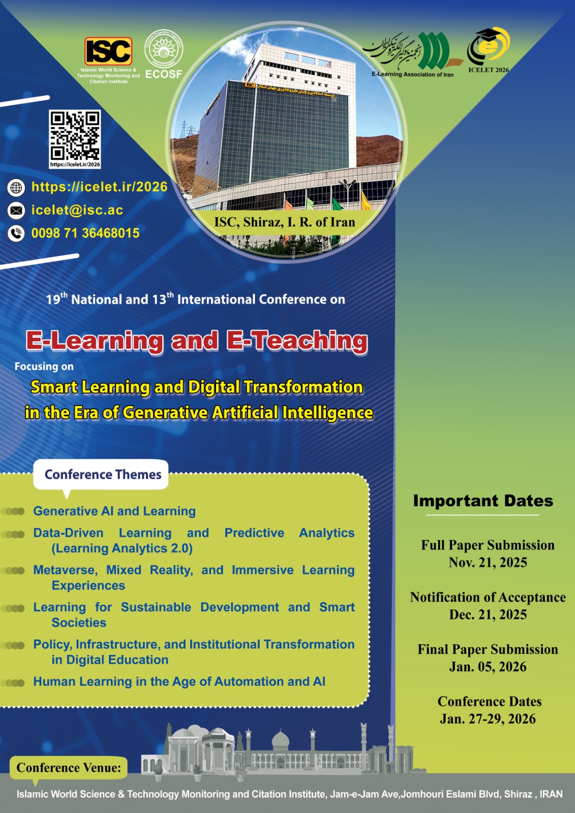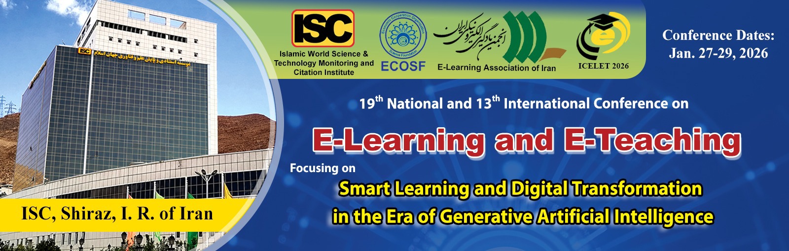 The 19th National and the 13th International Conference on e-Learning and e-Teaching (ICeLeT 2026) will be held in a joint collaboration with the Iranian Association of e-Learning (YADA). This conference provides the premier interdisciplinary forum for researchers, practitioners and educators to present and discuss the most recent innovations, trends, and concerns, practical challenges encountered and the solutions adopted in the field of e-Learning and e-Teaching.